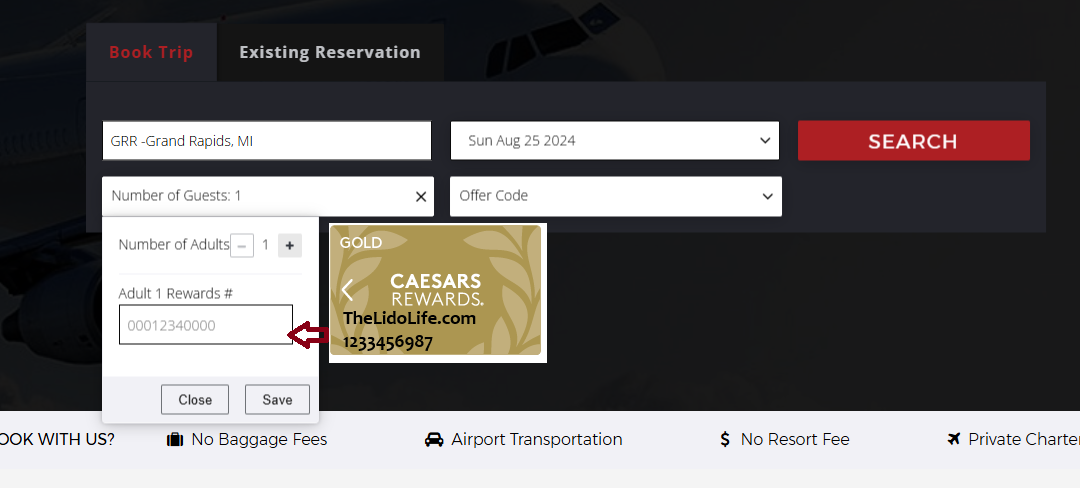 When you first get to the site you will select an airport close to you. Some airports are seasonal they fly out of, some are year round. After selecting an airport you can select the number of guests and a date.Don't worry the date will give you a range and show all flights from that airport for 3 months after the date selected. Understand you will only be able to see flights out for about 6 months or so. They add trips every few months so makes you check back. You may put your rewards number in now in the spot illustrated in the picture above. Or you can choose to see the full prices first.